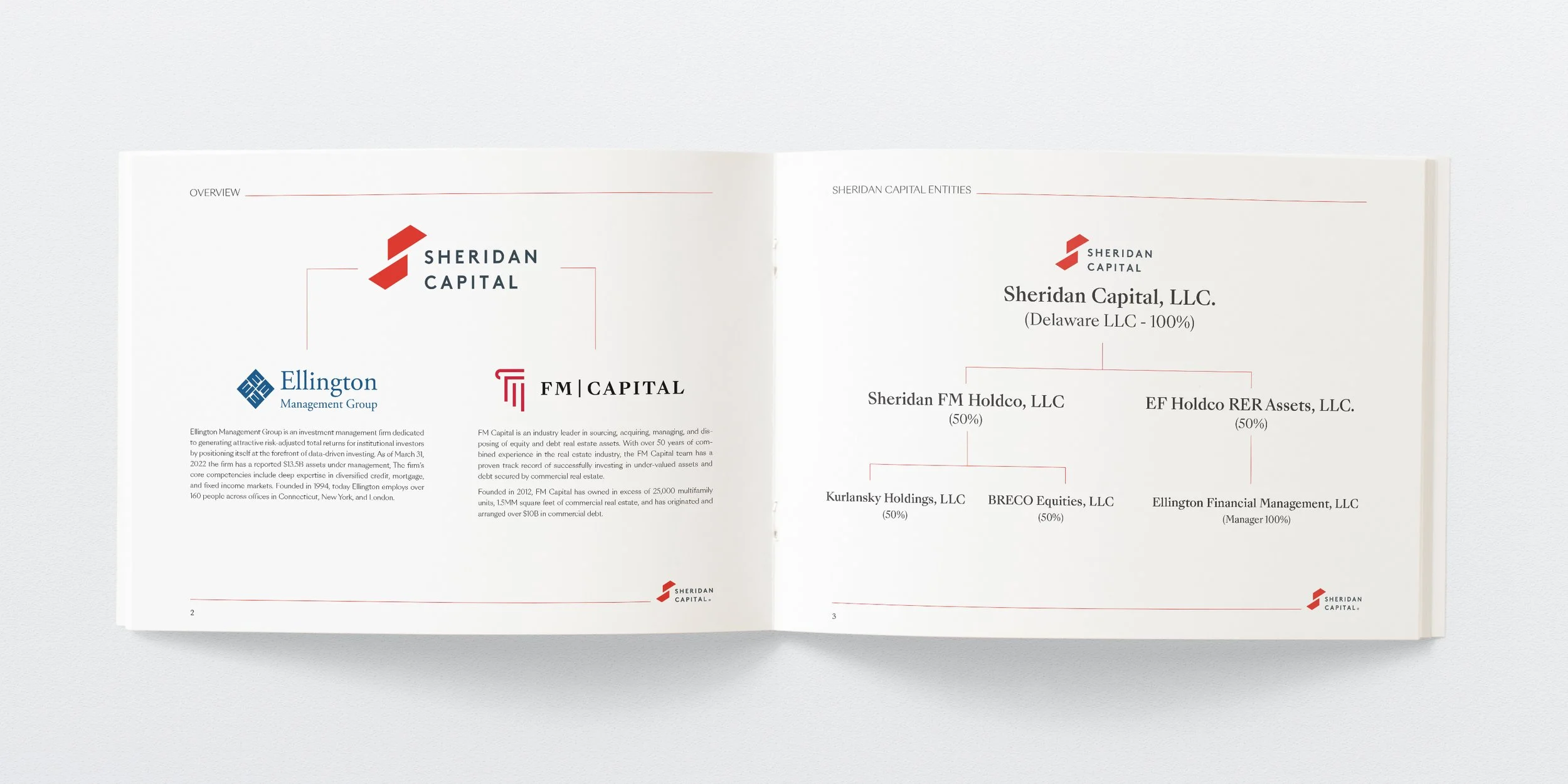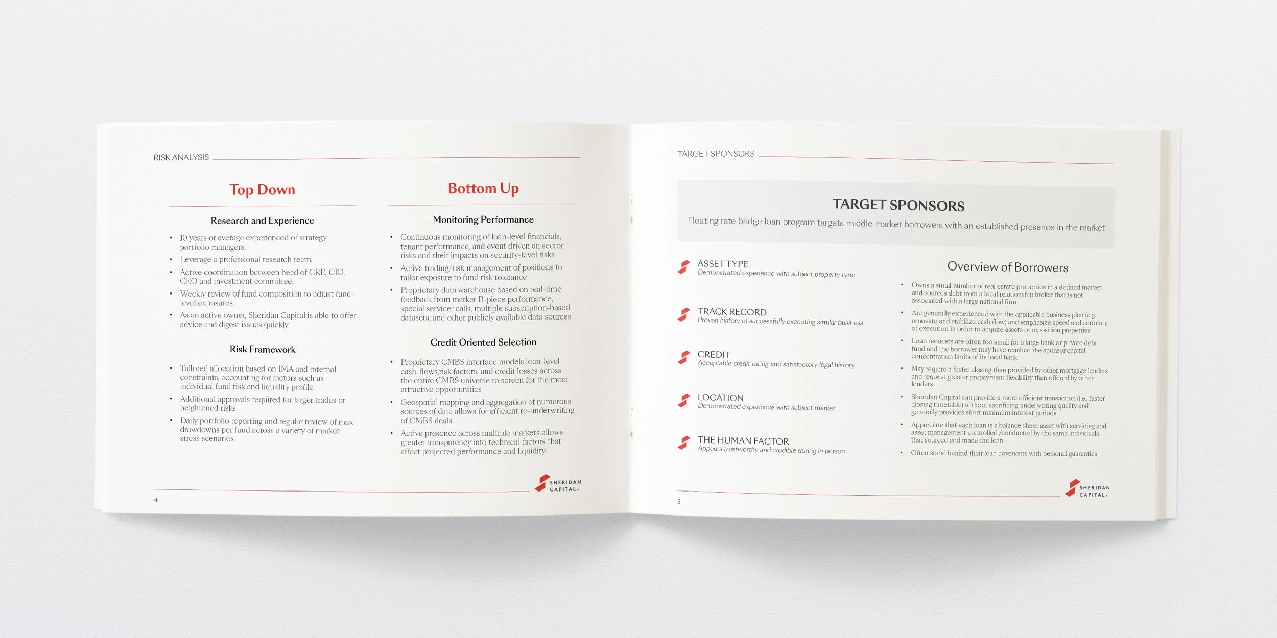 Sheridan Capital is a commercial real estate bridge lender. I created printed and digital collateral highlighting deals along with product parameters and the pitchbook below, used as a presentation tool for potential clients.
